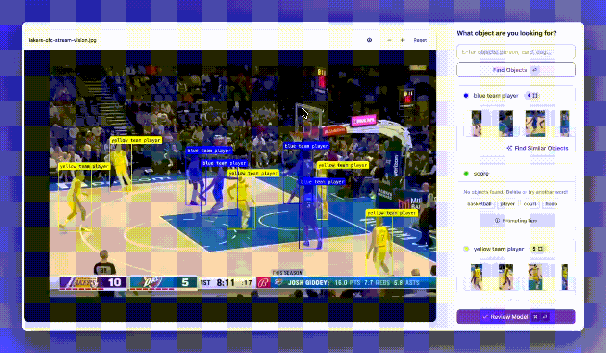 Start by describing what you're looking for and let the AI find it across your images or video. Type "hard hat," "player in the yellow team," or "defective weld" and watch Rapid locate every instance automatically.