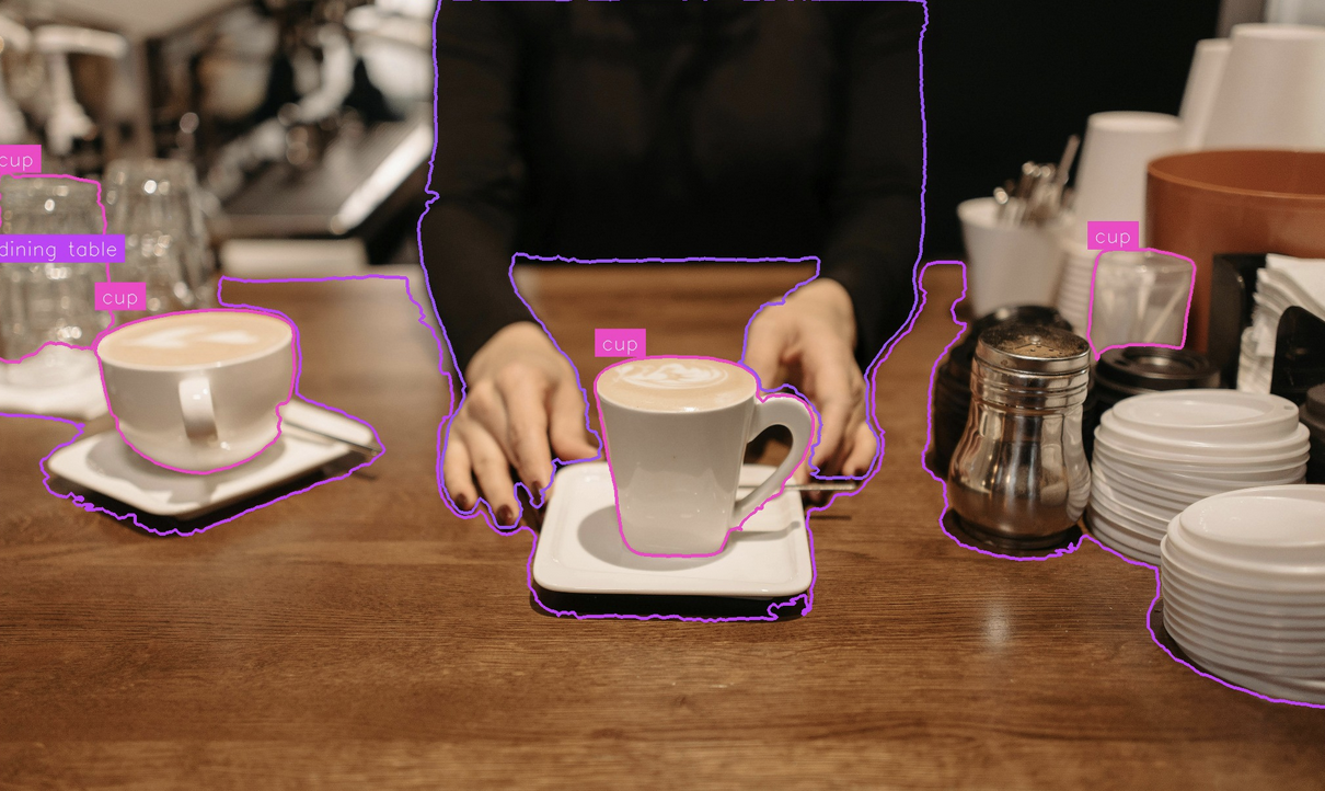 This Workflow uses an RF-DETR model to detect objects, then uses SAM 2 to segment objects. The results are then visualized and returned. Here is an example of the workflow running on an image that contains common objects which our model is trained to identify: