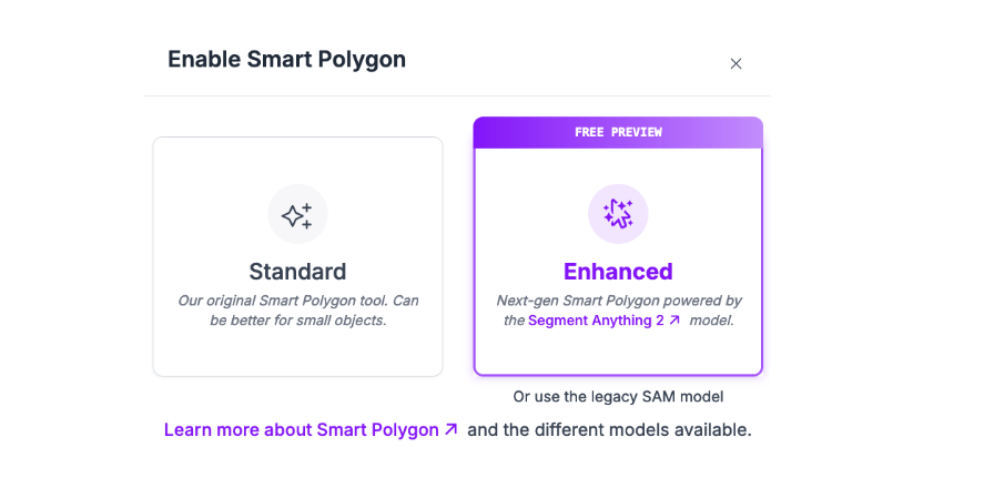To use the feature, navigate to any image in a dataset you own in Roboflow. Click the Smart Polygon cursor icon in the right task bar and select the "Enhanced" option powered by SAM 2.