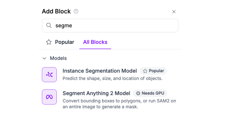 To use SAM 2 with Roboflow Workflows, create a new Workflow then add a "Segment Anything 2" block to your project: