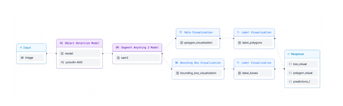 Roboflow Workflows allows you to build complex computer vision applications from a web-based application builder. If you run a Workflow with a Dedicated Deployment, you can use SAM 2 as part of your Workflow.