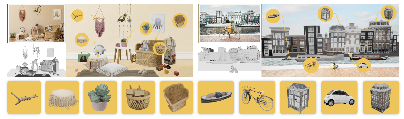 - Compose aligned meshes and object splats into coherent 3D scenes