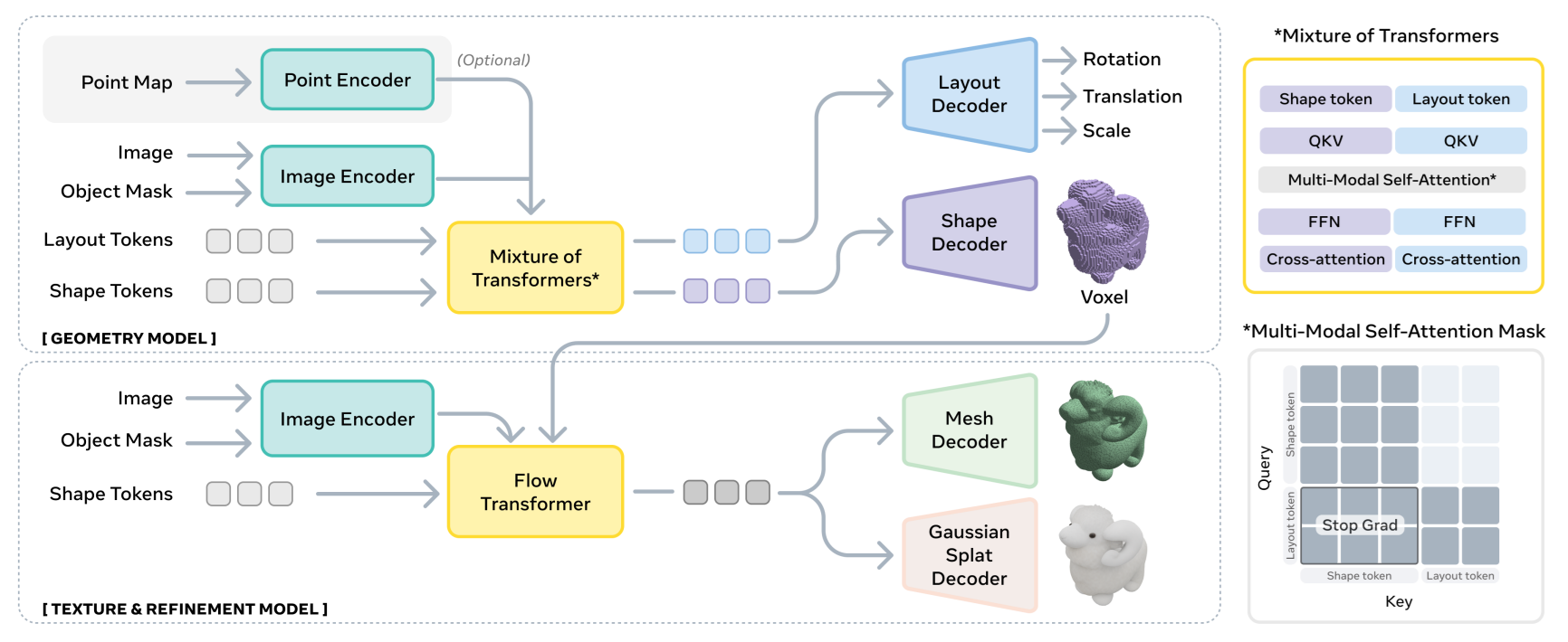 The first major block is the Geometry Model, which predicts a coarse 3D voxel representation of the object and its layout in the scene (rotation, position, and scale). A coarse 3D voxel representation in SAM 3D is simply a rough, low-resolution 3D grid that describes the basic shape of the object before any fine details or textures are added. This Geometry model is a 1.2B-parameter flow transformer built using the Mixture-of-Transformers (MoT) architecture.