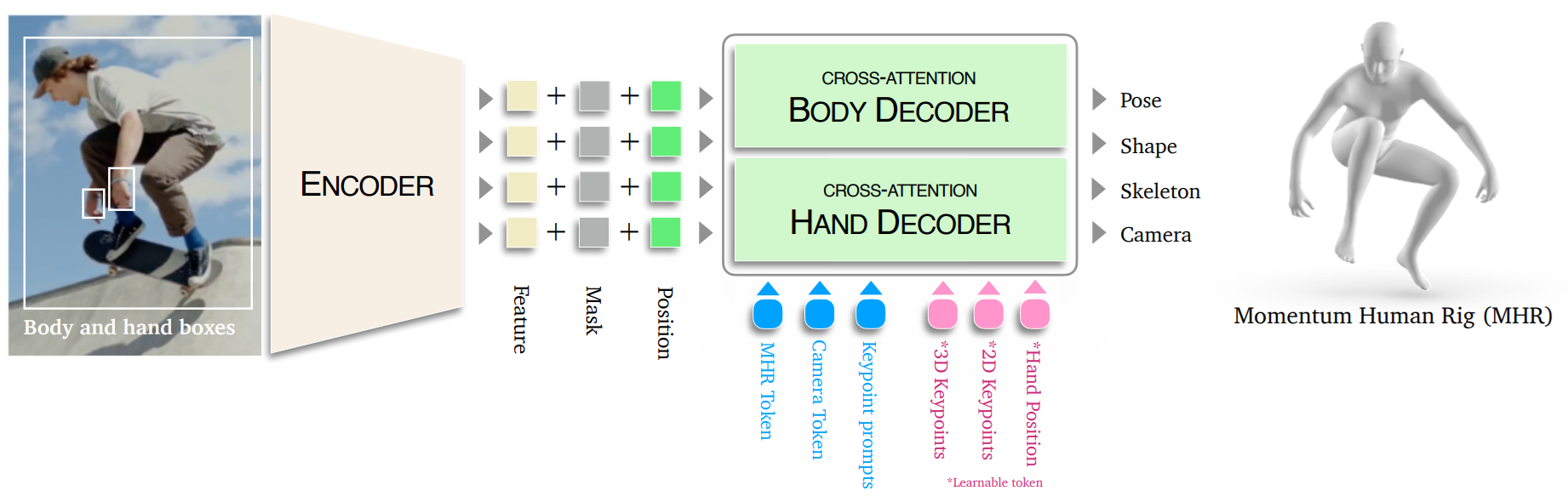 - MHR + Camera Token: A learnable token that encodes an initial estimate of the human’s pose, shape, camera parameters, and skeleton. This token serves as the starting point for predicting the final Momentum Human Rig parameters.