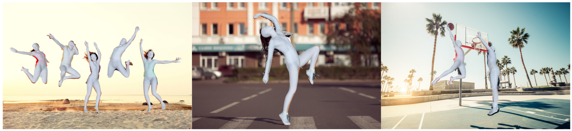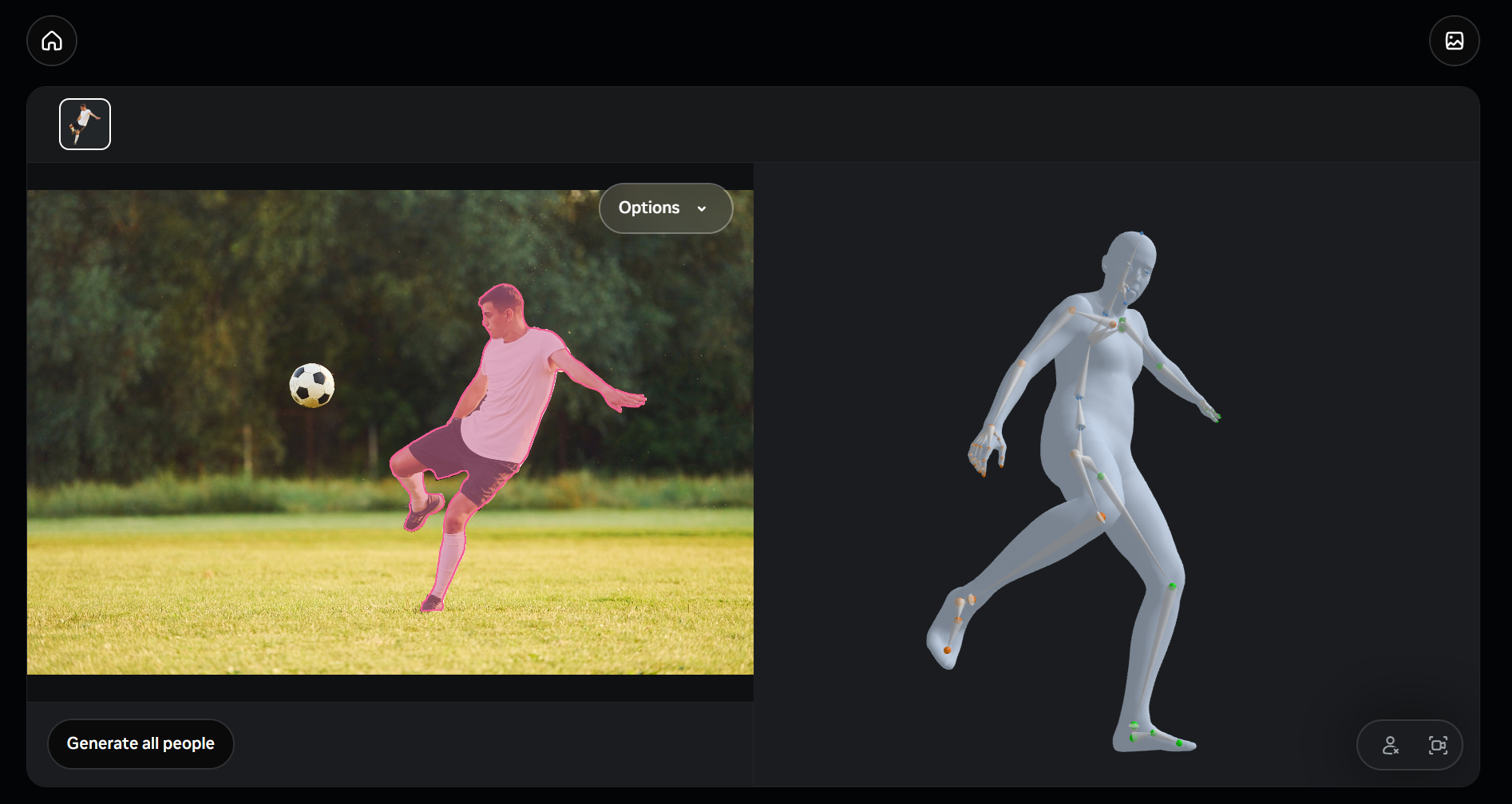 AM 3D Body (3DB) is designed to recover a full 3D human body mesh from a single image in a flexible, controllable way. The model supports interactive inputs, meaning it can incorporate extra hints such as 2D keypoints or segmentation masks to refine the reconstruction. This promptable design gives the system more context when handling difficult poses, occlusions, or unusual viewpoints, and allows users or downstream applications to guide the prediction process when needed.