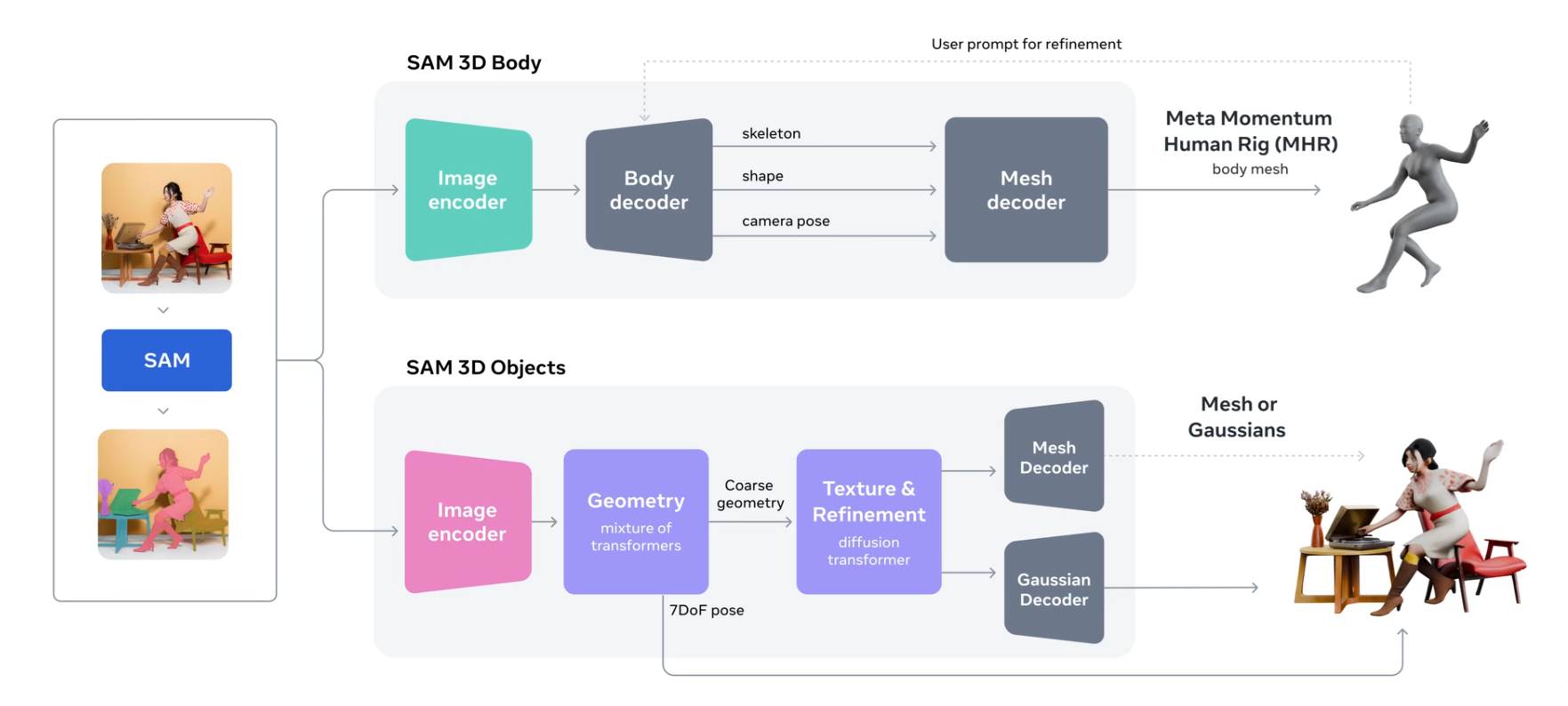 What makes it especially powerful is its ability to handle real-world photos, where objects may be partly hidden, surrounded by clutter, or viewed in messy environments. Instead of breaking down in these conditions, SAM 3D uses visual cues from the surrounding scene to make intelligent predictions about the hidden or unclear parts of the object. This release comprises two specialized models: