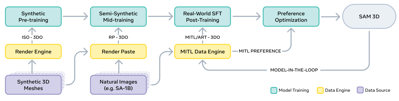 SAM 3D is trained using a multi-stage pipeline that gradually teaches the model harder skills. Starting with simple synthetic objects and ending with realistic, human-aligned 3D reconstructions. This strategy is similar to how LLMs or robotics models learn i.e. first build basic capabilities, then expose the model to more complex data, and finally align it with human preferences.