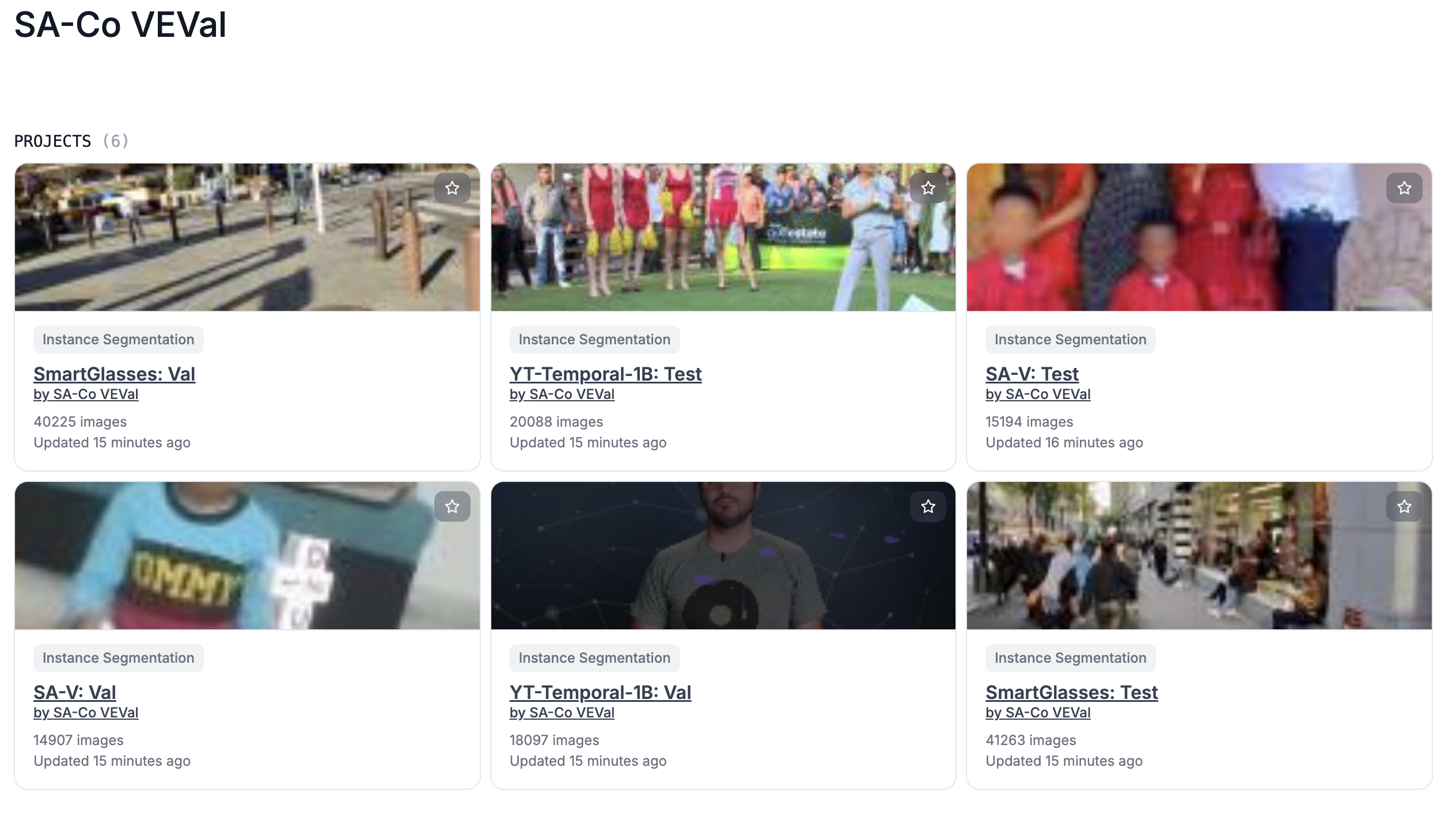 Along with SAM 3, Meta created a new benchmark, the SA-Co evaluation benchmark, which you can explore on Roboflow Universe. This new benchmark has 214K unique phrases, 126K images and videos, and over 3M media-phrase pairs with challenging hard negative labels to test open-vocabulary recognition.