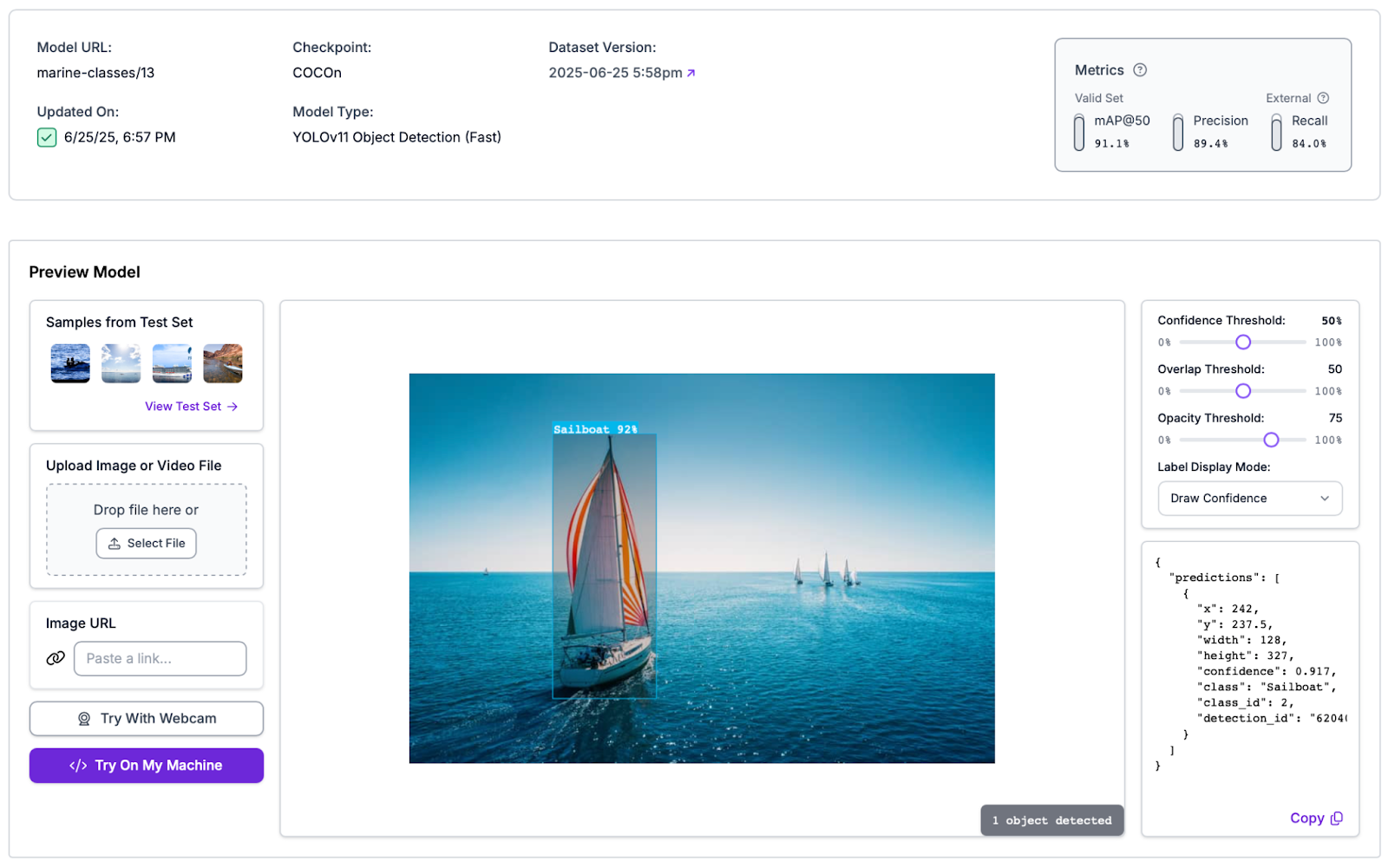 With Roboflow, I wasn’t just training models faster — I was making smarter decisions about how to structure my datasets, and I had visibility into performance at every step. That efficiency turned what was once a frustrating cycle of guesswork into a streamlined workflow, letting me focus more on building the marine detector application itself, including additional functionality like API support for external events, MQTT, and cosmetic improvements to the UX.