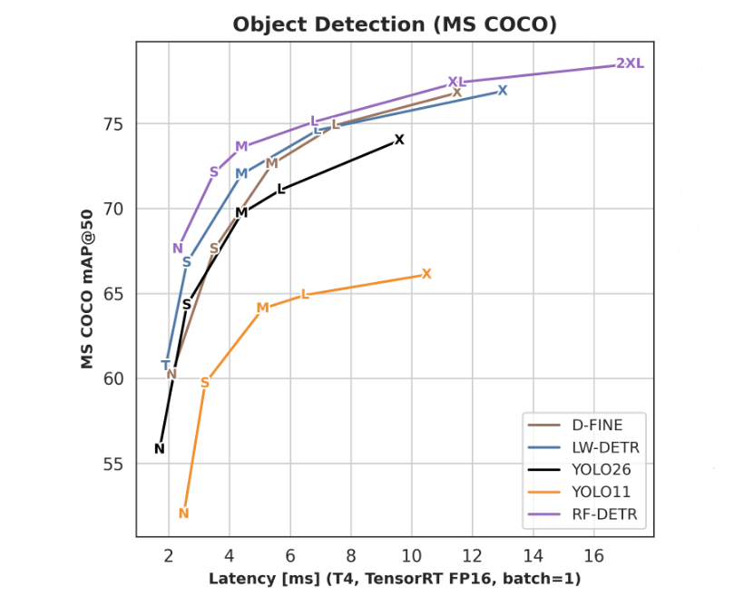 We'll be looking specifically at the RF-DETR XL version, which achieves a score of 77.4 on COCO mAP@50. With TRT compilation at FP16 with batch_size=1 it runs at about 12ms on T4 GPU.