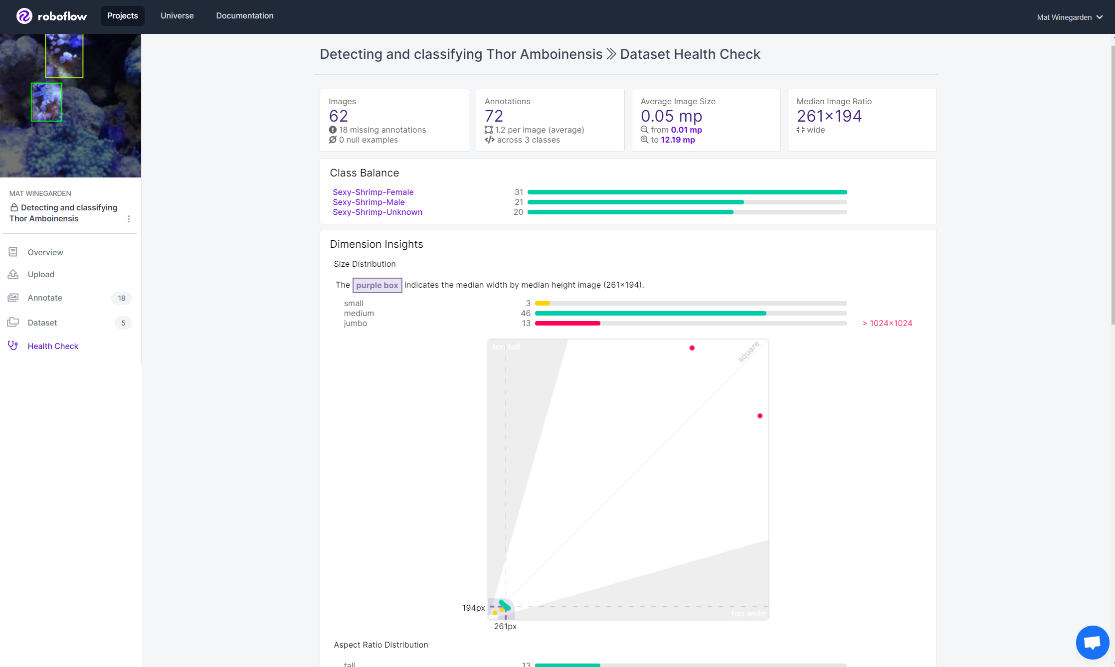 After I annotated and reviewed my own work, I did a basic Health Check to get a feel for the number of annotations and the balance of classes before moving on to the Preprocessing and Augmentations stages where I can really boost the performance of my model.