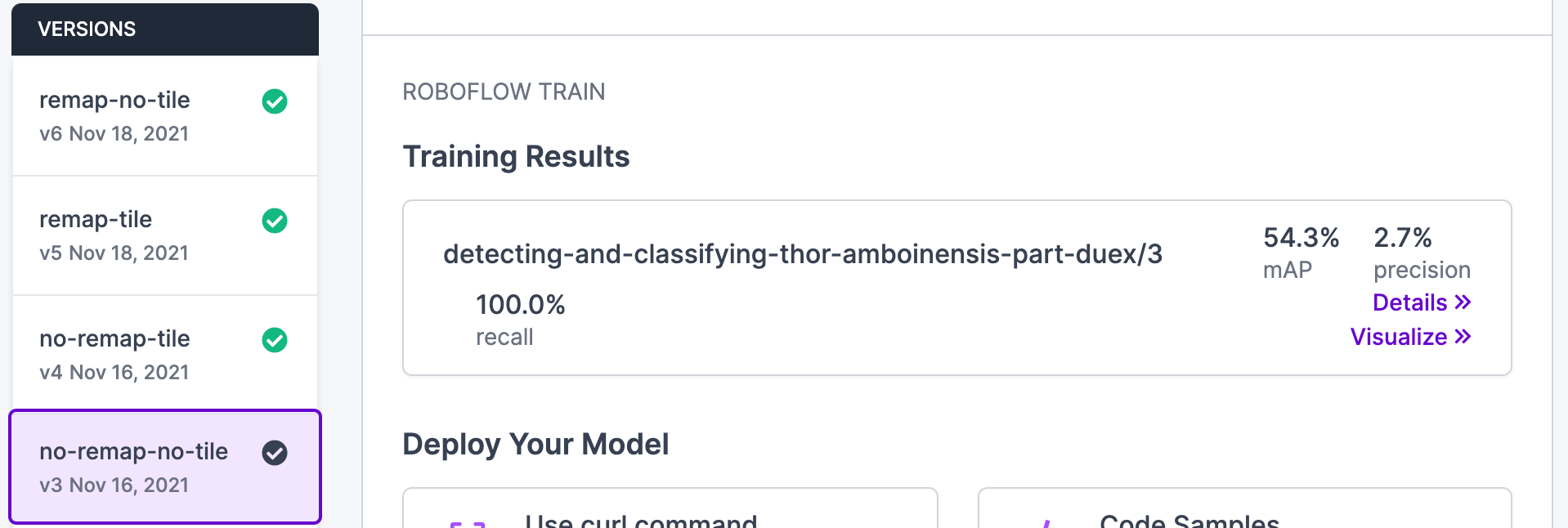 At this point, I could upload a few larger images to balance things out, but I was eager to press on, so with the advice given by our Machine Learning Lead, Jacob Solawetz, I decided to head over to pre-processing and utilize the Resizing step to unify the images sizes so the model doesn't train on super small images of the shrimp.