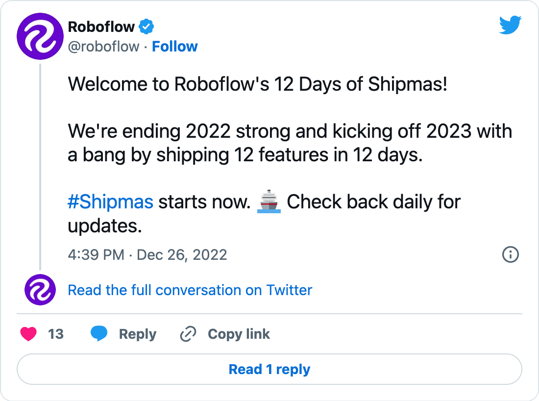 We coined the 12 Days of #Shipmas and shipped 12 new features in 12 days. New updates were released to improve model-assisted labeling, model training, Roboflow Universe, our annotation tools, the REST API, Python SDK, and more.