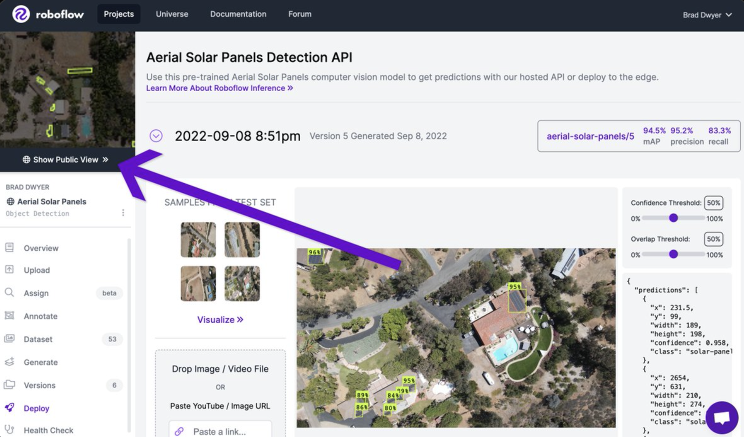 It's now easier to share your work with your friends and followers with cross-linking between the editable of your project and the public view on Roboflow Universe. Show off your hard work by sharing your datasets & models.