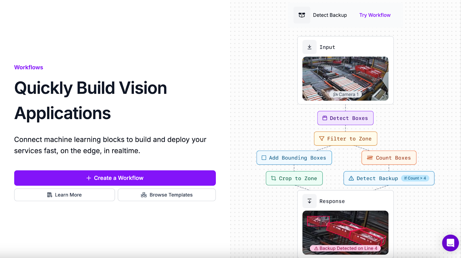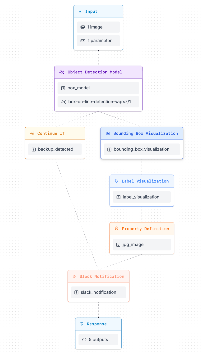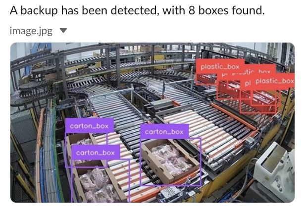 In this guide, we built a system that uses an object detection model to identify boxes on an assembly line, determines if there was a backup of more than four plastic boxes, and sends a slack message if a backup was detected.