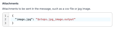 Add the generated jpg image to the attachments section of your Slack notification block. You’ll want to add the filename, such as image.jpg, followed by a reference to the output image, $steps.<block_name>.output