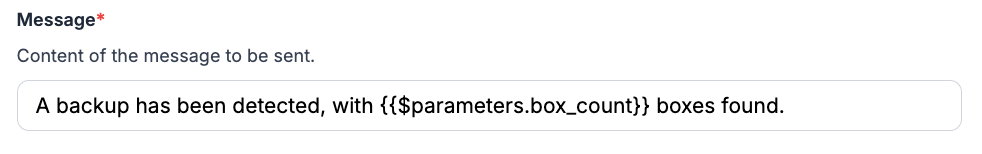 Next, we'll configure the slack notification block to send “A backup has been detected, with {{$parameter.box_count}} boxes found” to a specified slack channel.