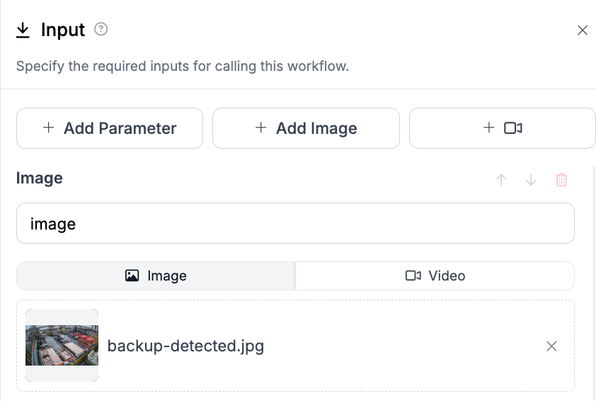 Our workflow will accept a single image as an input (which could also be a frame from a video). Your workflow will accept a single image by default, but you can configure the workflow to accept multiple images or parameters using the Input block.