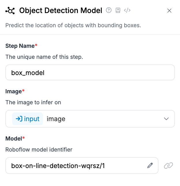To do this, click on the “Object Detection Model” block and select a model. We’ll be using the box-on-line-detection-wqrsz/1 model trained on Assembly Line Boxes. For this example, I’ve added plastic_box