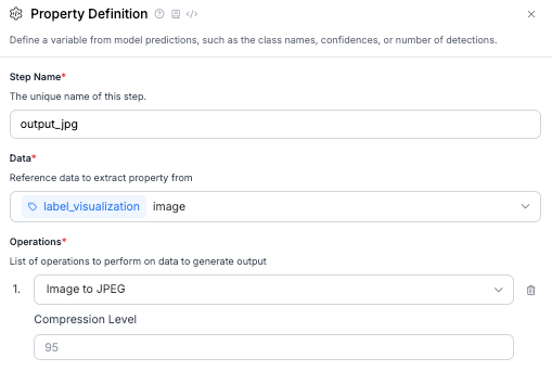 - Add a property definition block and convert the label visualization output image to jpg format.