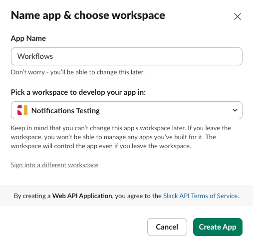 Create a new slack app if you don’t have one already to send notifications on your behalf. You’ll want to choose the from scratch configuration option.