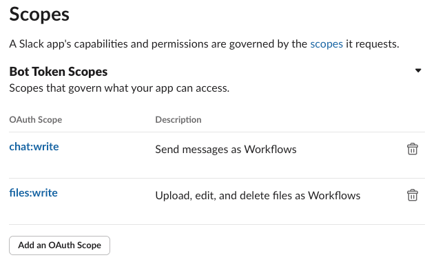 - files:write: for sending attachments in channels. Note: the bot must be in the channel to send attachments