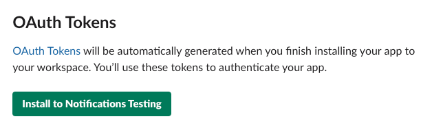 Install the app to your workspace to gain access to your Slack OAuth Token. Once that completes, you’ll be granted an access token with the following format: xoxb-XXXX