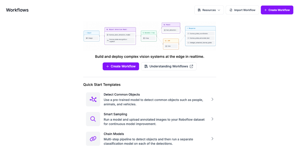 To get started, first create a free Roboflow account. Then, navigate to the Roboflow dashboard and click the Workflows tab in the left sidebar. This will take you to the Workflows homepage, from which you can create a workflow.