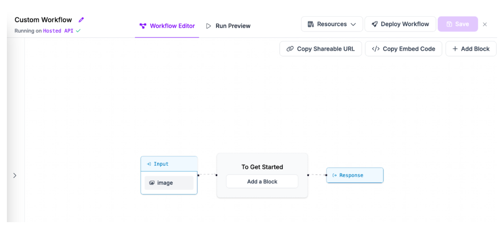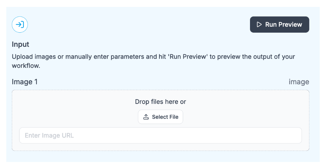 To test the Workflow, click “Run Preview” at the top of the Workflows editor. Then, drag in the image you want to use: