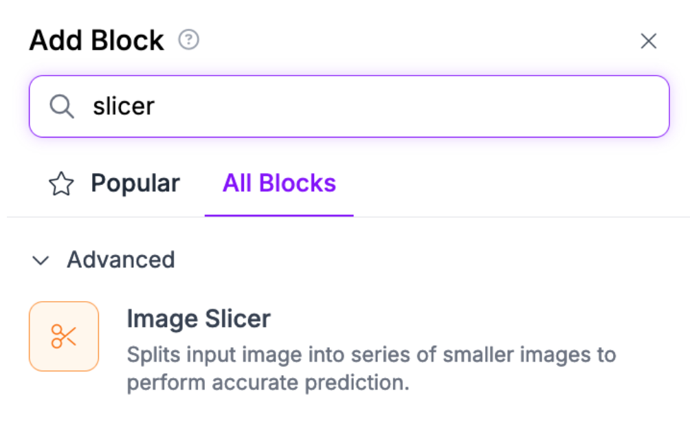 Click “Add Block” in the top right corner of the Workflows editor and add an Image Slicer block:
