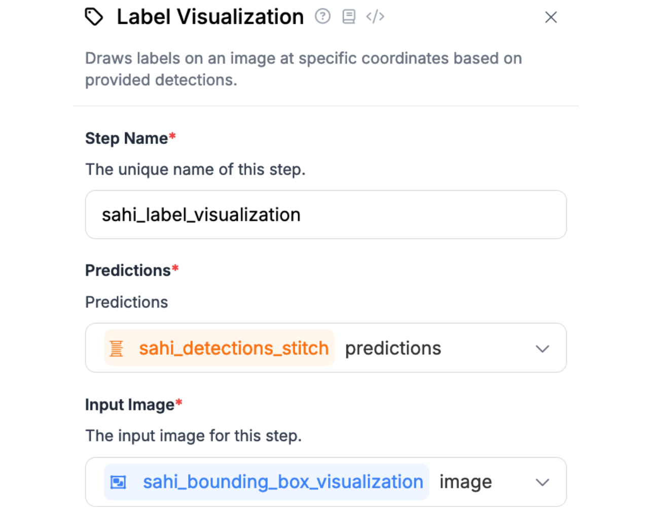 Set the image input as the Image Slicer images, and the detections input as the detections from your object detection model: