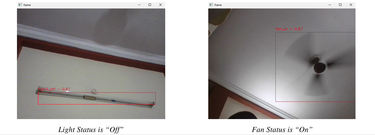 - The object detection model is trained to detect the on/off status of lights and the spinning/not spinning status of fans.