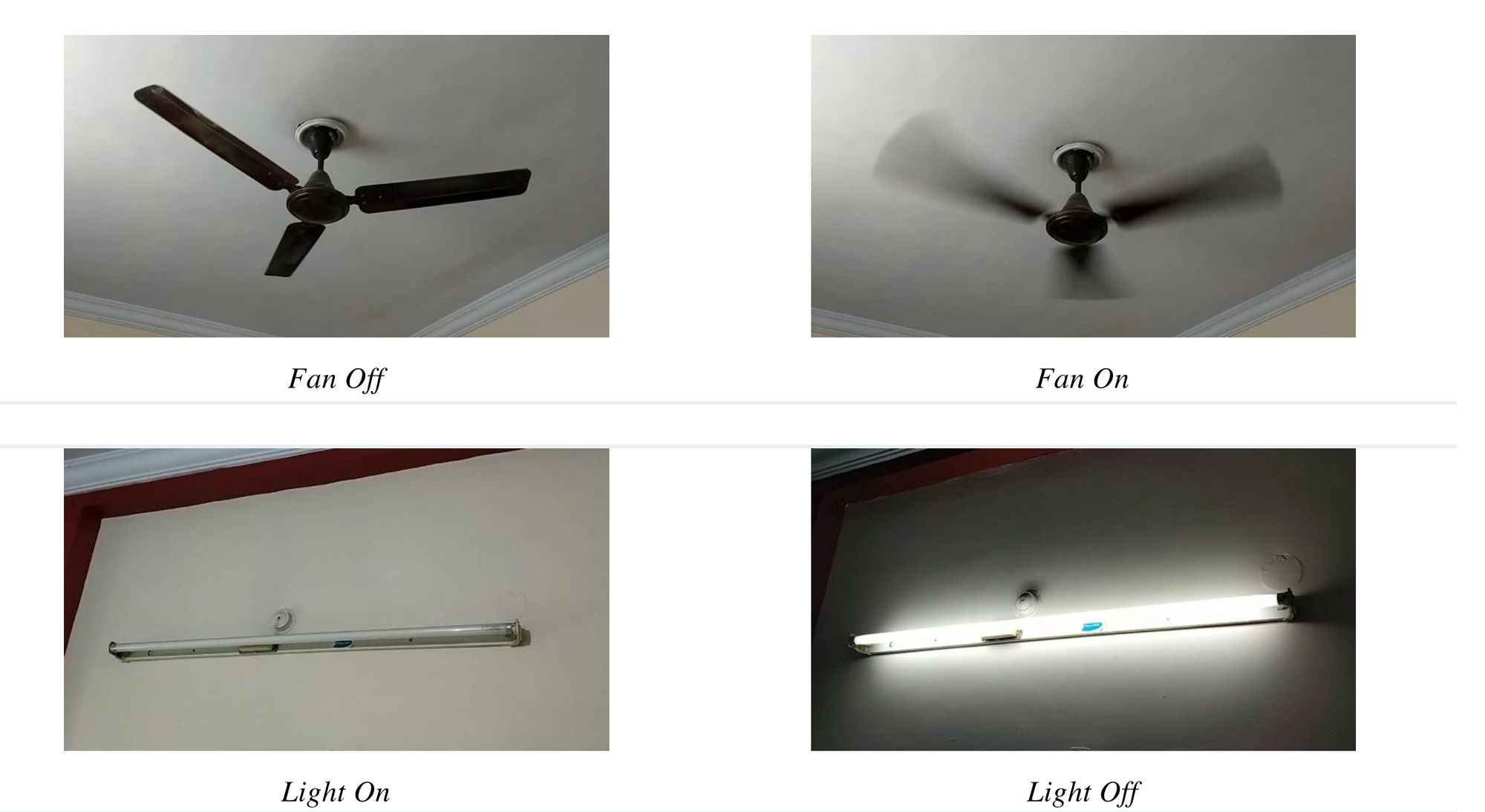 cv2.destroyAllWindows()The output similar to following will be generated when you run the code. Here we see light and fan in individual frames with their status.