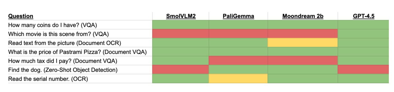SmolVLM2 passed our object counting, document OCR, document VQA, and real-world OCR tasks. The model did not pass our zero-shot object detection and movie scene VQA tasks.