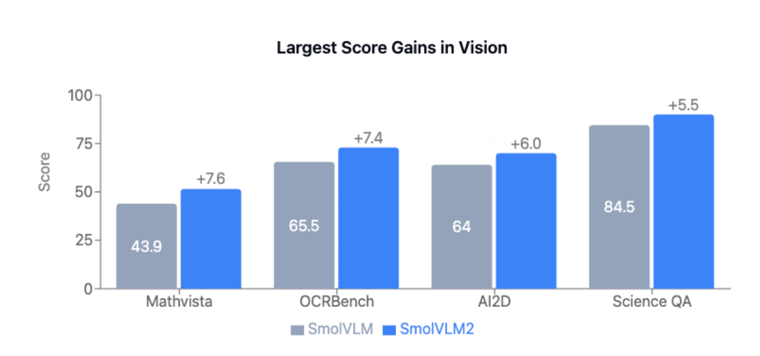 SmolVLM2 comes in three sizes: 256M, 500M, and 2.2B. The larger the model, the better performance you can expect on your tasks. When compared with the first SmolVLM model released in November 2024, SmolVLM outperformed on the Mathvista, OCRBench, AI2D, and ScienceQA benchmarks: