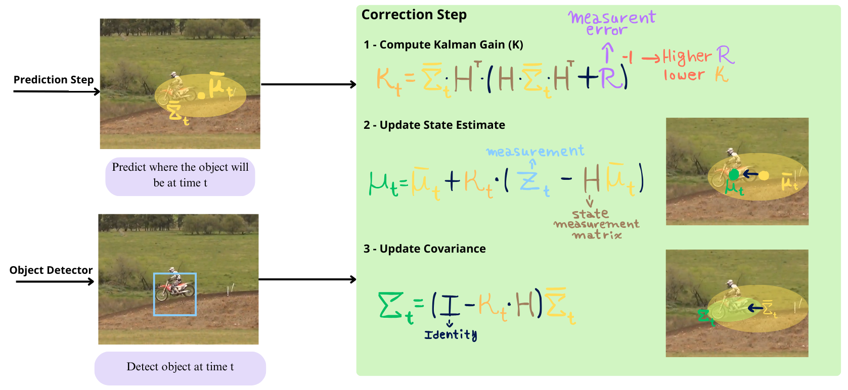 Once we make the matches, the Kalman Filter can refine our detected objects and velocity based on the velocity model that we imposed. This is just the classic Kalman Filter Correction step, where we compute the Kalman Gain and adjust the object position weighting the object detection and the linear model prediction, taking into consideration the detection and prediction noise.
