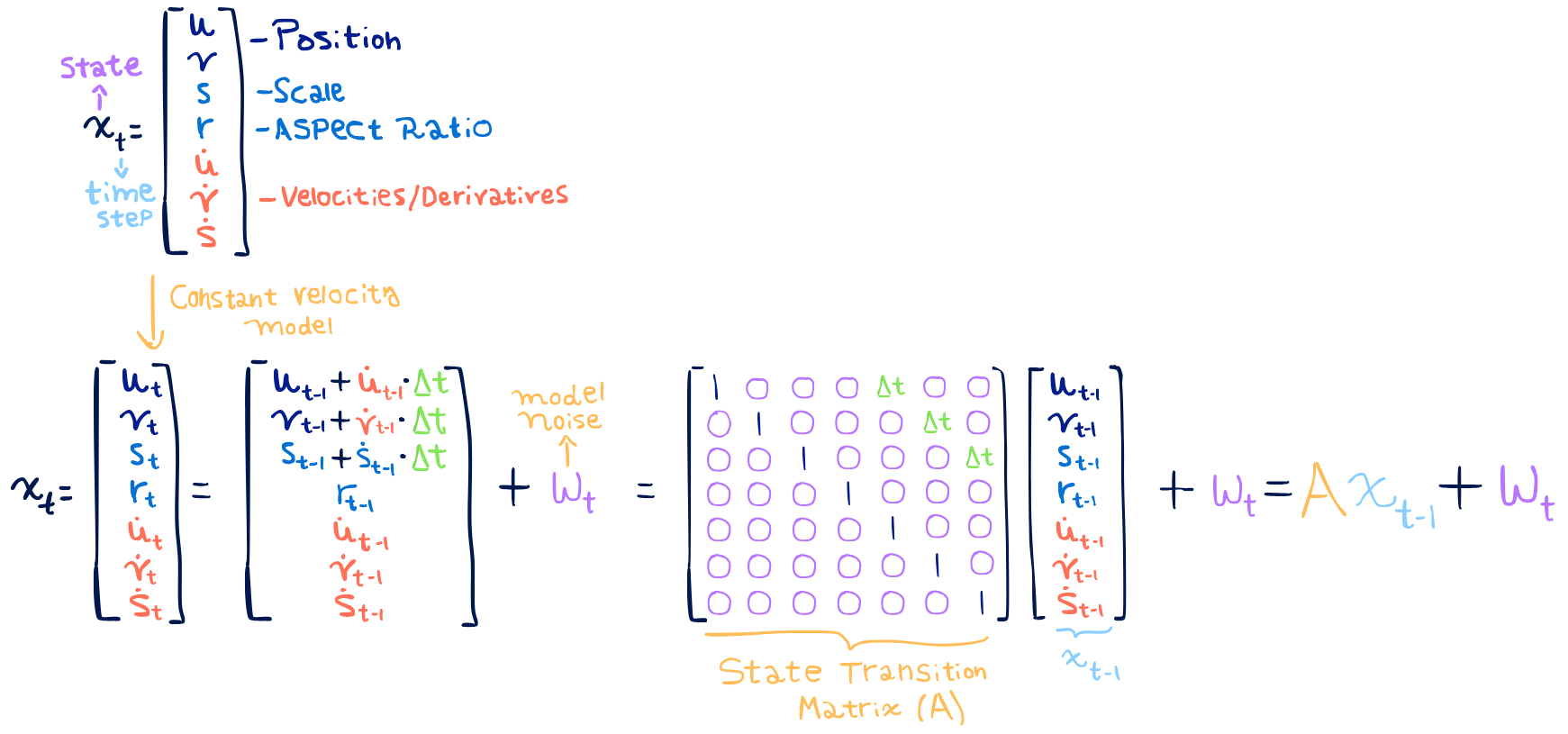 So let’s write down the model that SORT proposes for the Kalman Filter. To begin with, the state that we have at each time step will include: