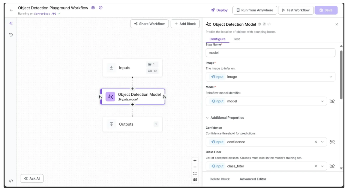 Next, we need to configure certain parameters from the Inputs block, such as image, model, confidence, and class_filter, to be used by the Object Detection Model block.