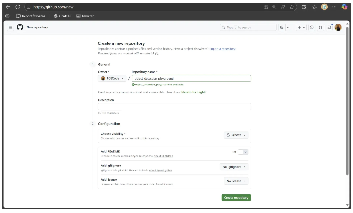 Start by creating a new repository named ‘object_detection_playground’ at https://github.com/new, as shown below: