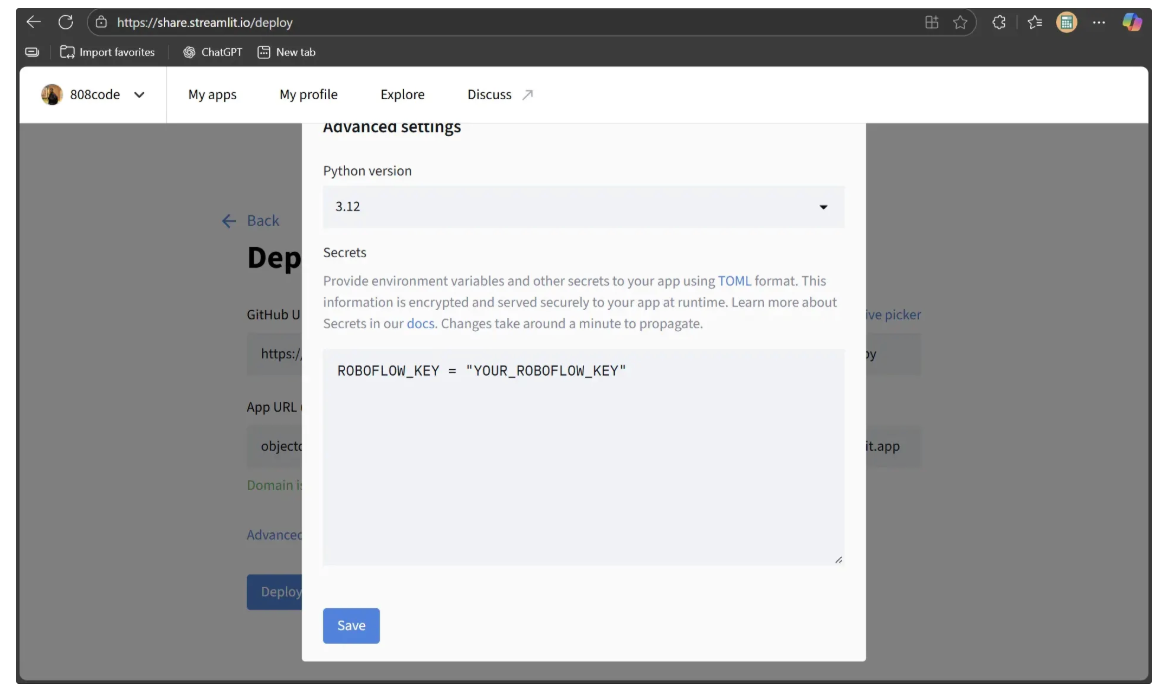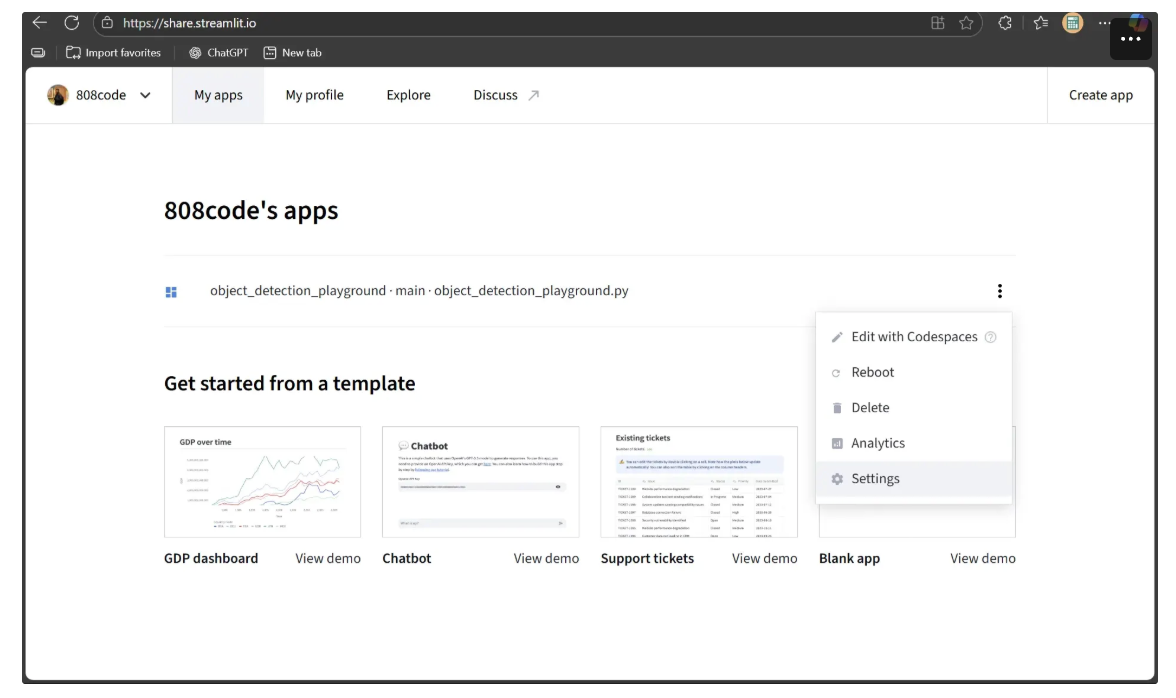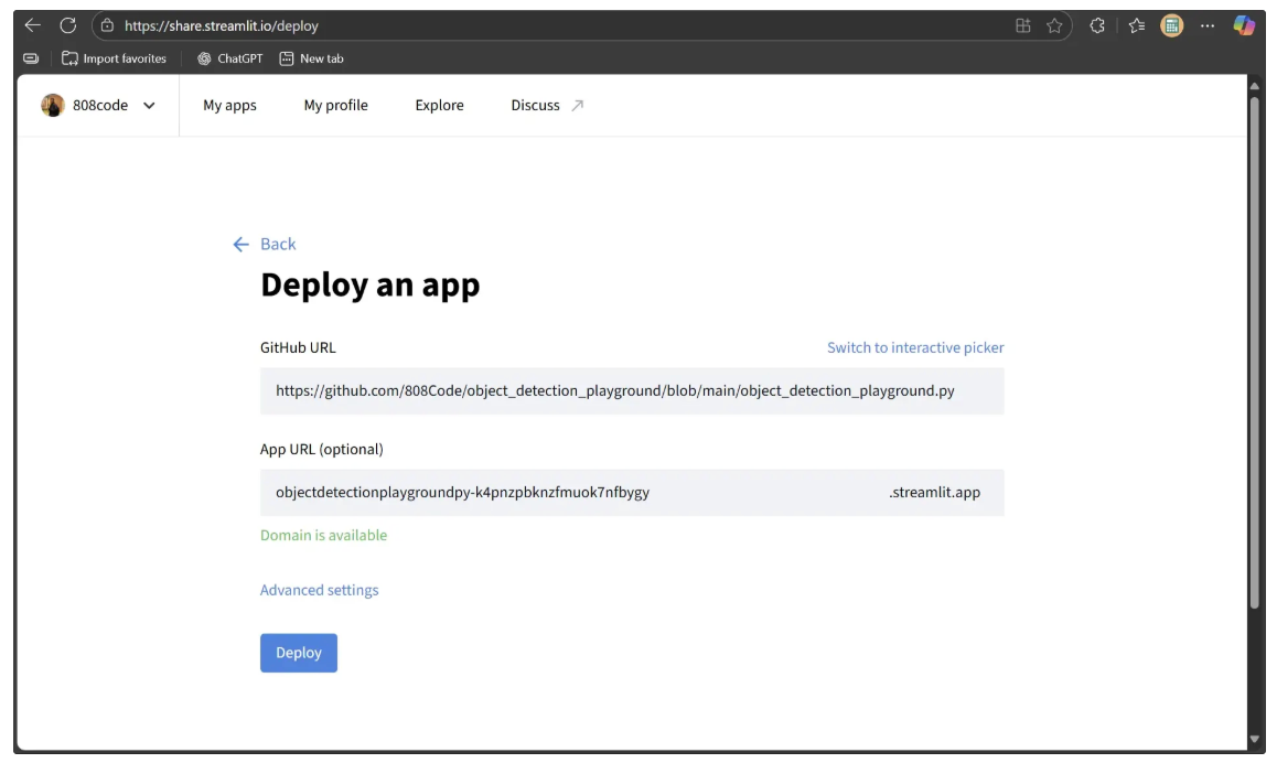 To make the Object Detection Playground accessible to everyone, it needs to be deployed. While there are several deployment options, we’ll use Streamlit’s own service, which is free and easy to set up. Before deploying, the project must be pushed to a GitHub repository.