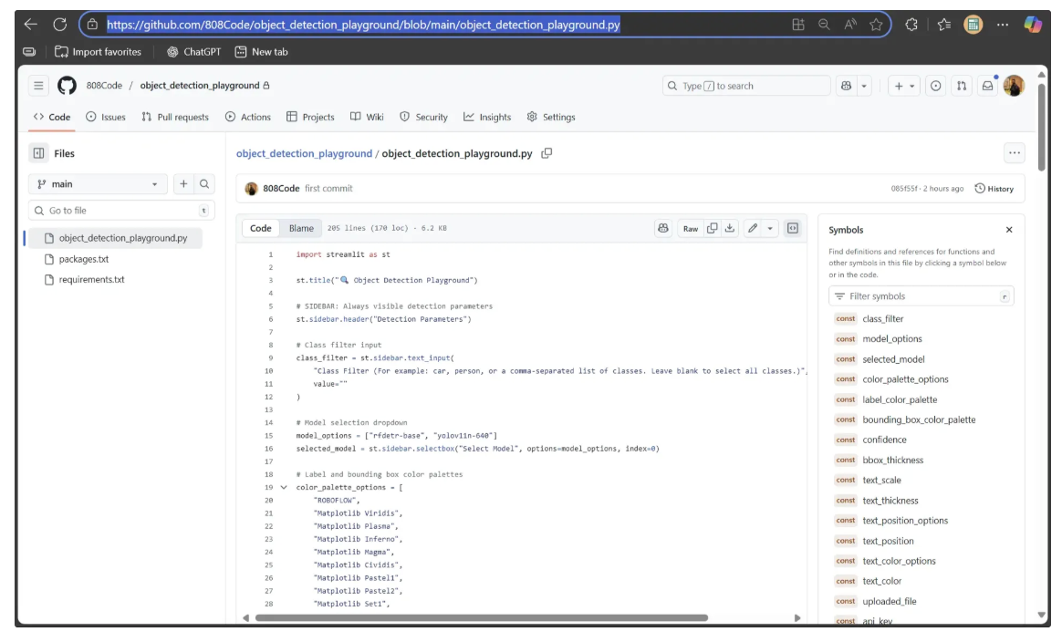 The GitHub URL entered in the form above should point to the object_detection_playground.py (Streamlit script) file in your GitHub repository: