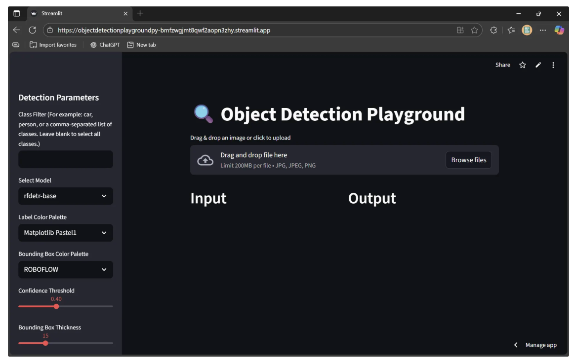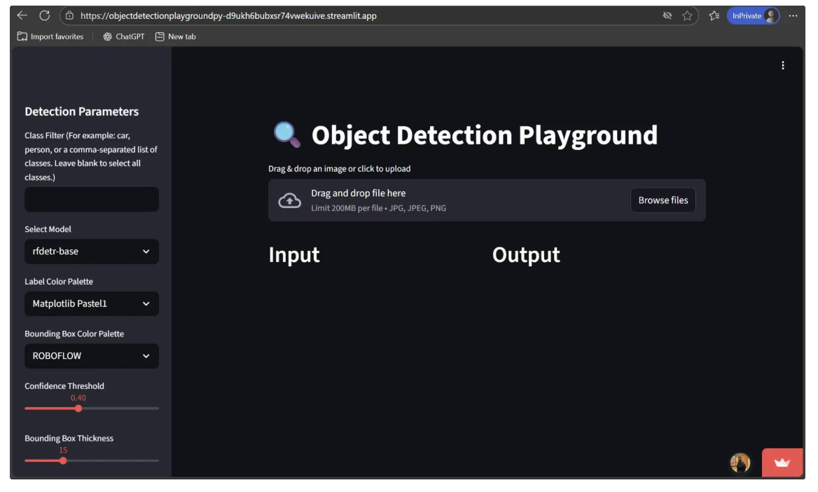 Finally, open the deployment link in an incognito window. If it loads successfully, your Object Detection Playground is fully deployed and ready to share, as shown below: