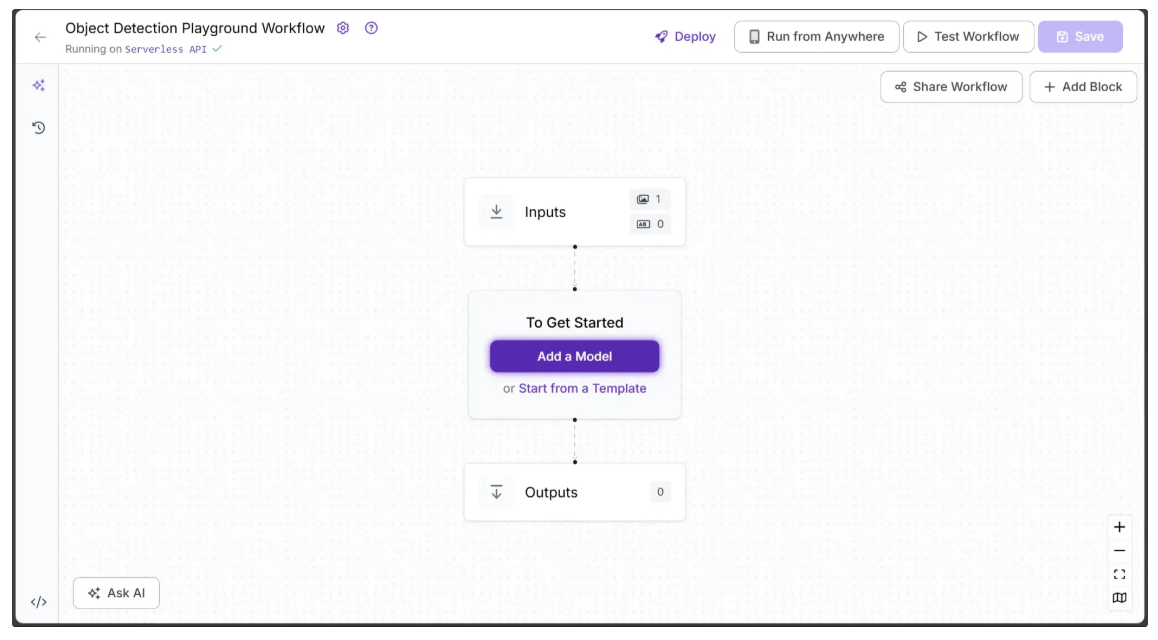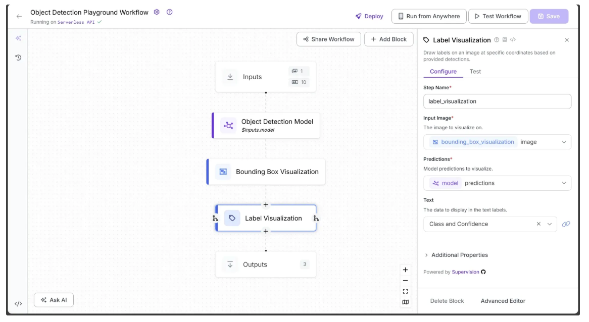 We use Roboflow Workflows to perform object detection and visualization. Roboflow Workflows is a low-code, open-source platform that simplifies the creation and deployment of computer vision pipelines. With Workflow blocks, you can combine object detection with other computer vision tasks, such as visualization, allowing you to visually design pipelines by connecting tasks as modular blocks.