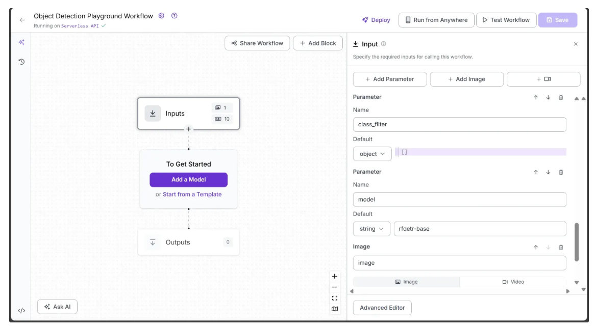 The image below shows the model and class_filter parameters that have been added as inputs to the workflow, while the image parameter is included by default. The model parameter is a string with a default value of ‘rfdetr-base’, and the class_filter parameter is an object that accepts a list of COCO classes to detect. If left empty, it will detect all objects in the image.