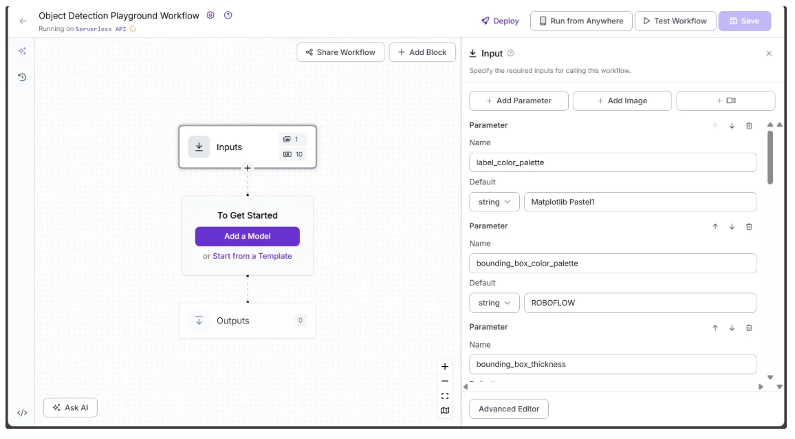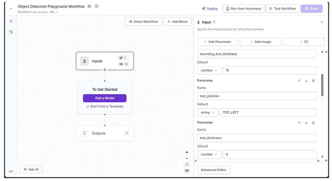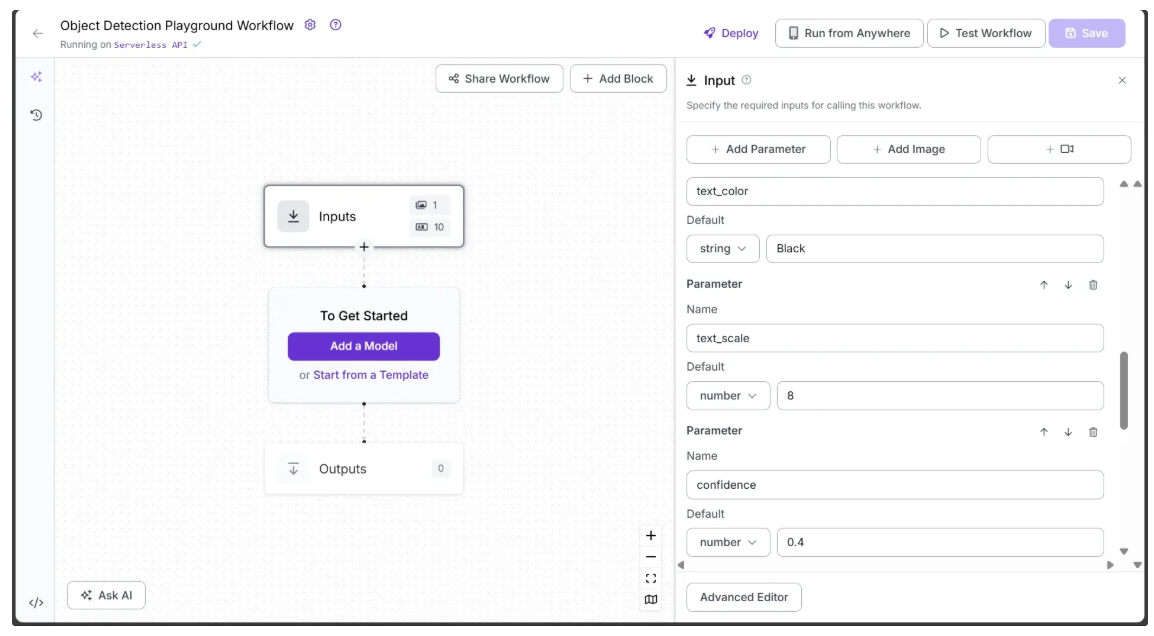 We want the object detection performed by the workflow to be fully configurable. To achieve this, we define input parameters that control how the workflow generates its output. The workflow then dynamically adapts based on the values provided for these parameters.