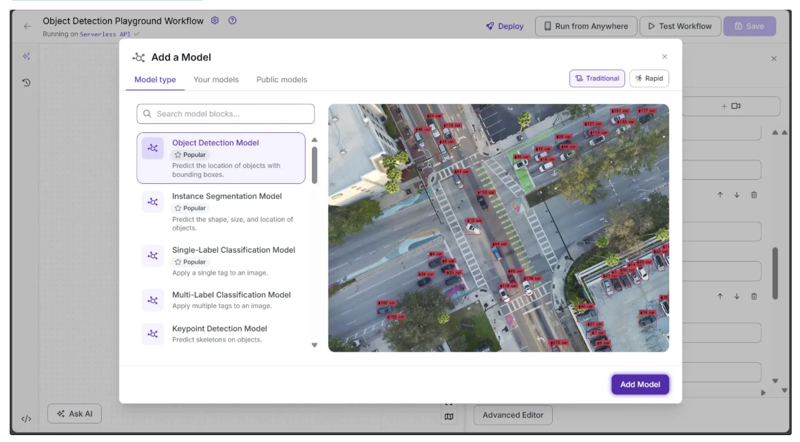 To add the block, click “Add a Model”, search for “Object Detection Model”, and then click Add Model, as shown below: