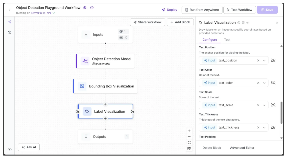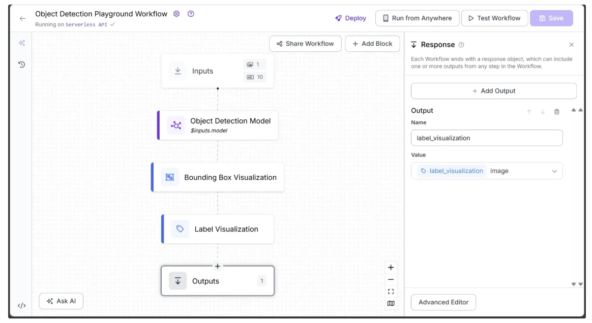 Ensure label_visualization is set as a workflow output and linked to the Label Visualization block’s image, which represents the final object detection result.