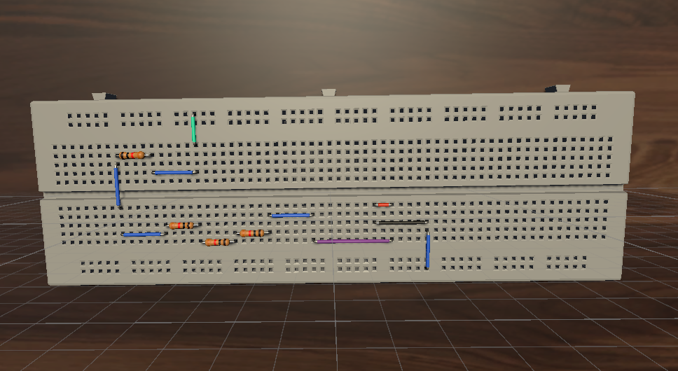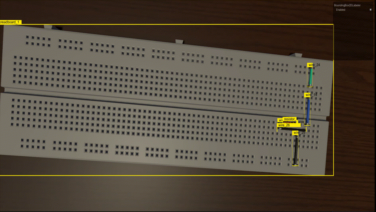 I acquired some cheap 3D models of a breadboard, a resistor, and some wires. Then, I followed the synthetic data with Unity Perception tutorial to generate synthetic data. I used the built-in TextureRandomizer and the RotationRandomizer, along with some custom randomizers for generating random circuits on random table backgrounds.