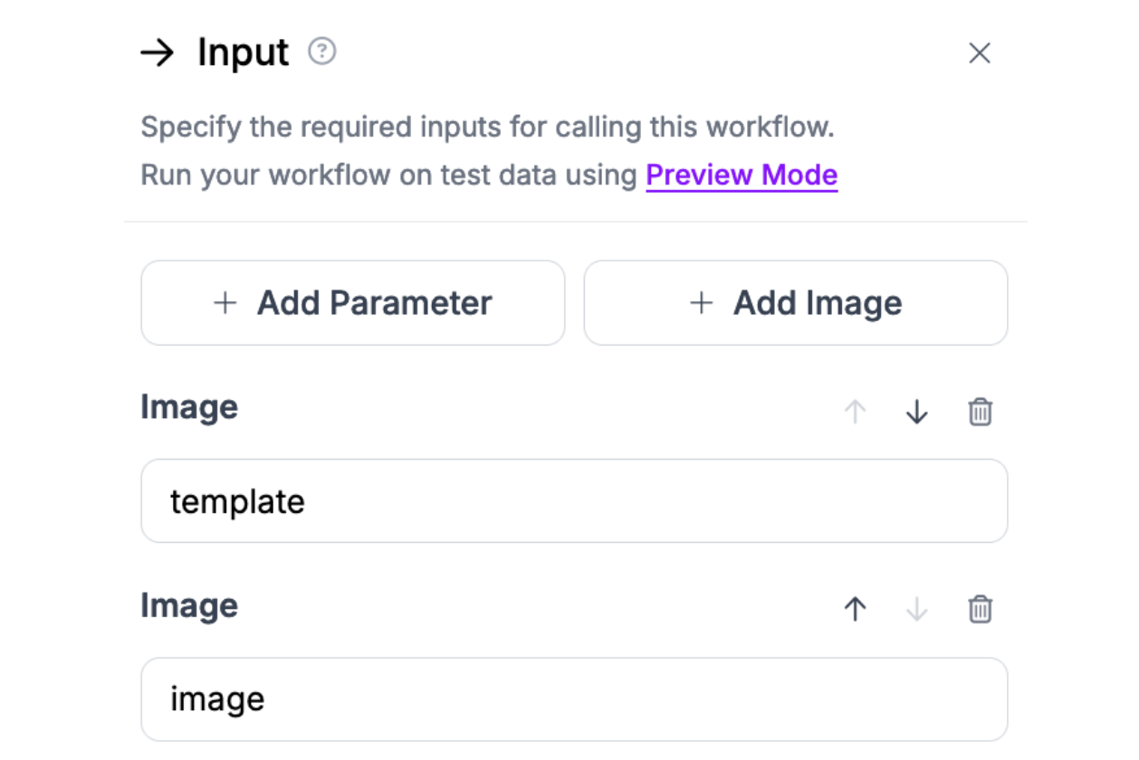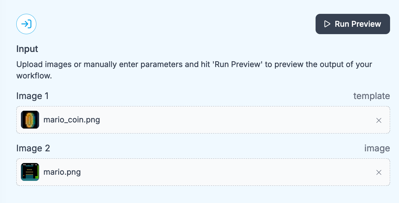 Click “Run Preview” in the top task bar in the Workflows editor. Set your input image and the template image:
