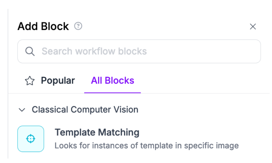 Click “Add Block” in the top right corner of the Roboflow Workflows builder, then search for “Template Matching”: